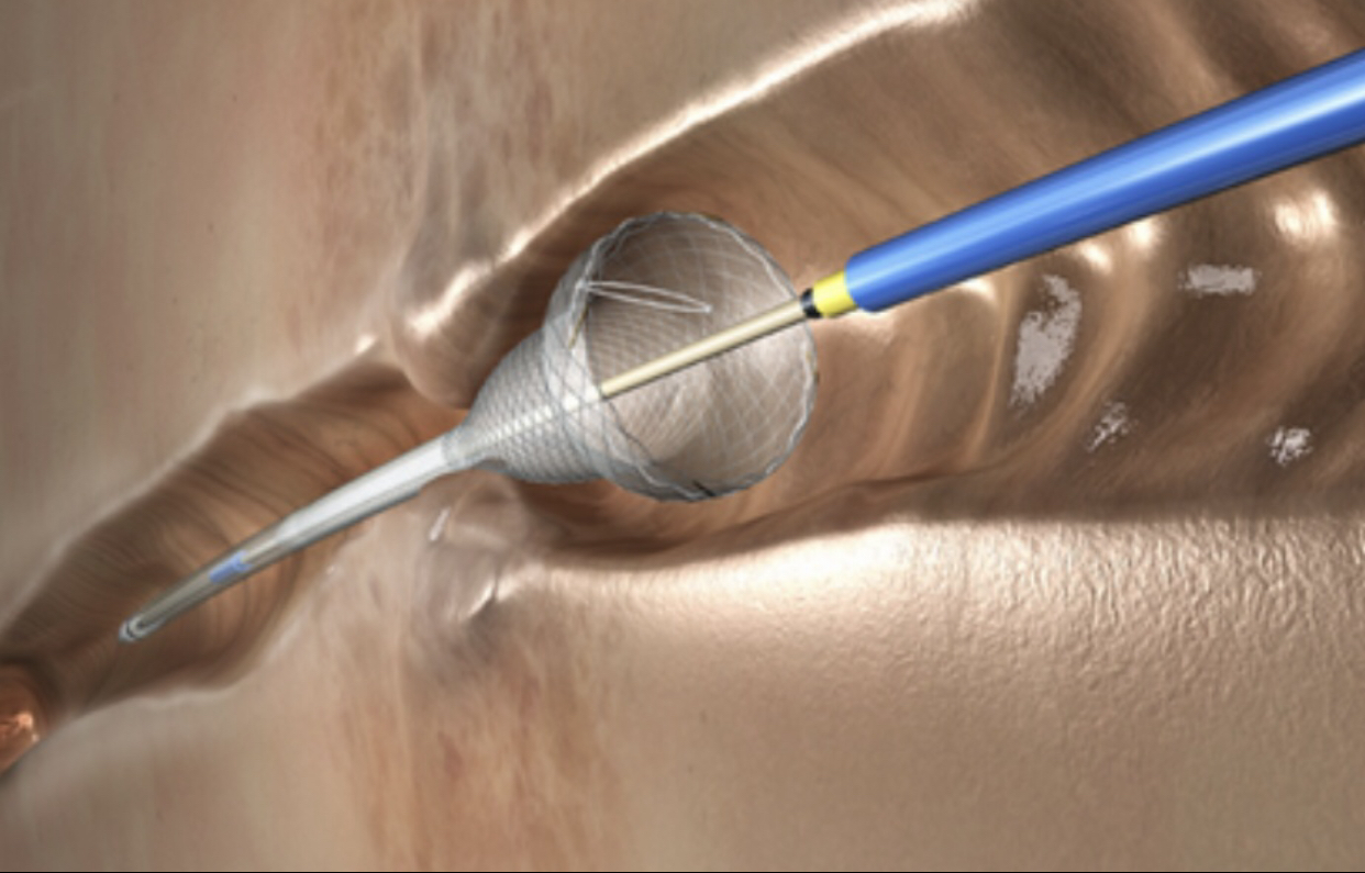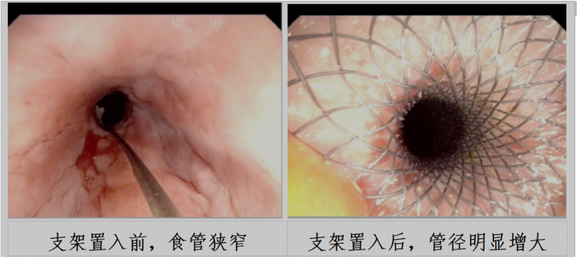 手术由我院长期坐诊专家苌新明教授操作,术前胃镜结果显示食管中段管腔狭窄严重,普通胃镜镜身不能通过,于是采用管径更细的导引钢丝自胃镜活检钳道插入,通过狭窄部位到达贲门,然后配合医师将胃镜徐徐退出而引导钢丝留置,选择粗细适当的扩张器,将其沿引导钢丝通过狭窄的部位正确定位后,退出胃镜导丝插入支架安装系统。