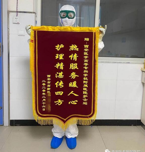 2月18日,一面写有“热情服务暖人心,护理精湛传四方”的锦旗送到西安医专附属医院隔离病区医护人员的手中。